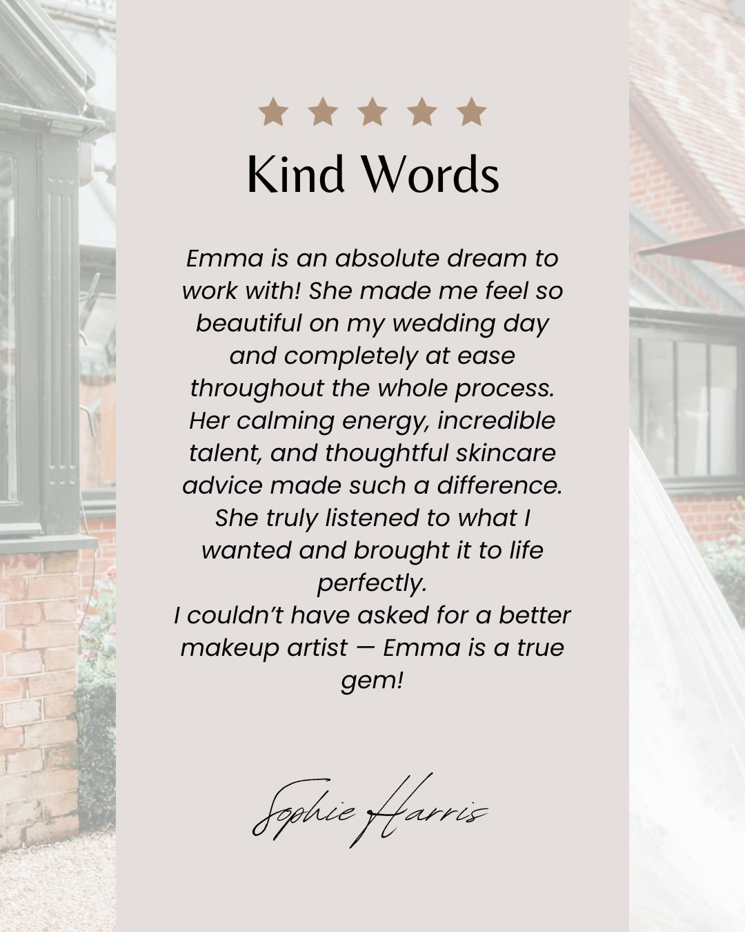 “I couldn’t be happier with Emma and my wedding day make up! Emma was an absolute gem, she was so friendly, calm, and reassuring throughout the whole morning. Her presence made getting ready feel relaxed and fun, and she really listened to what I wanted.”
